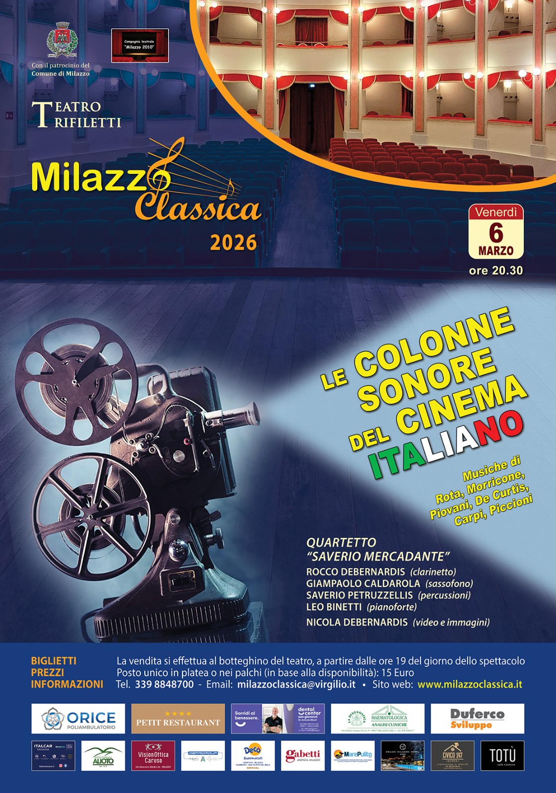 6 marzo 2026 -Milazzo,Teatro Trifiletti – “Le colonne sonore del Cinema Italiano”