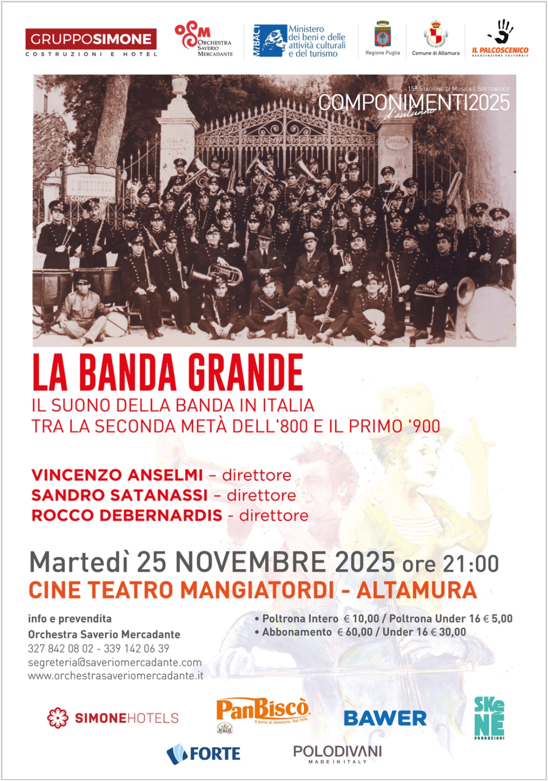 TEATRO MANGIATORDI ALTAMURALA BANDA GRANDE Il progetto vuole documentare e mettere a confronto alcuni capolavori del repertorio bandistico italiano tra '800 e primo '900. La particolarità del progetto prevede lo studio di composizioni originali per banda rispettando fedelmente l'organico previsto dall'autore attraverso l'utilizzo di tutti gli strumenti, anche quelli in disuso. Obiettivo del progetto è quello...