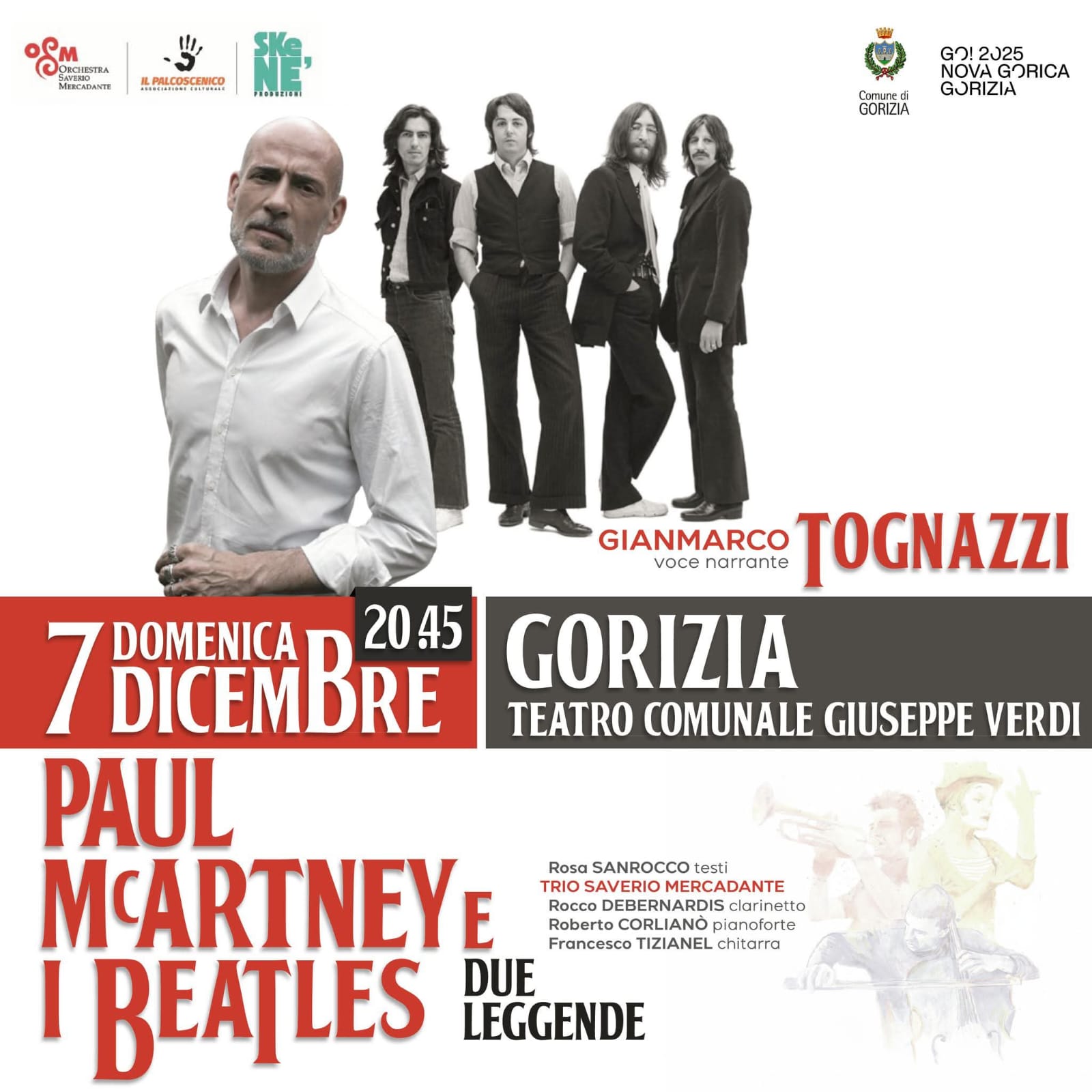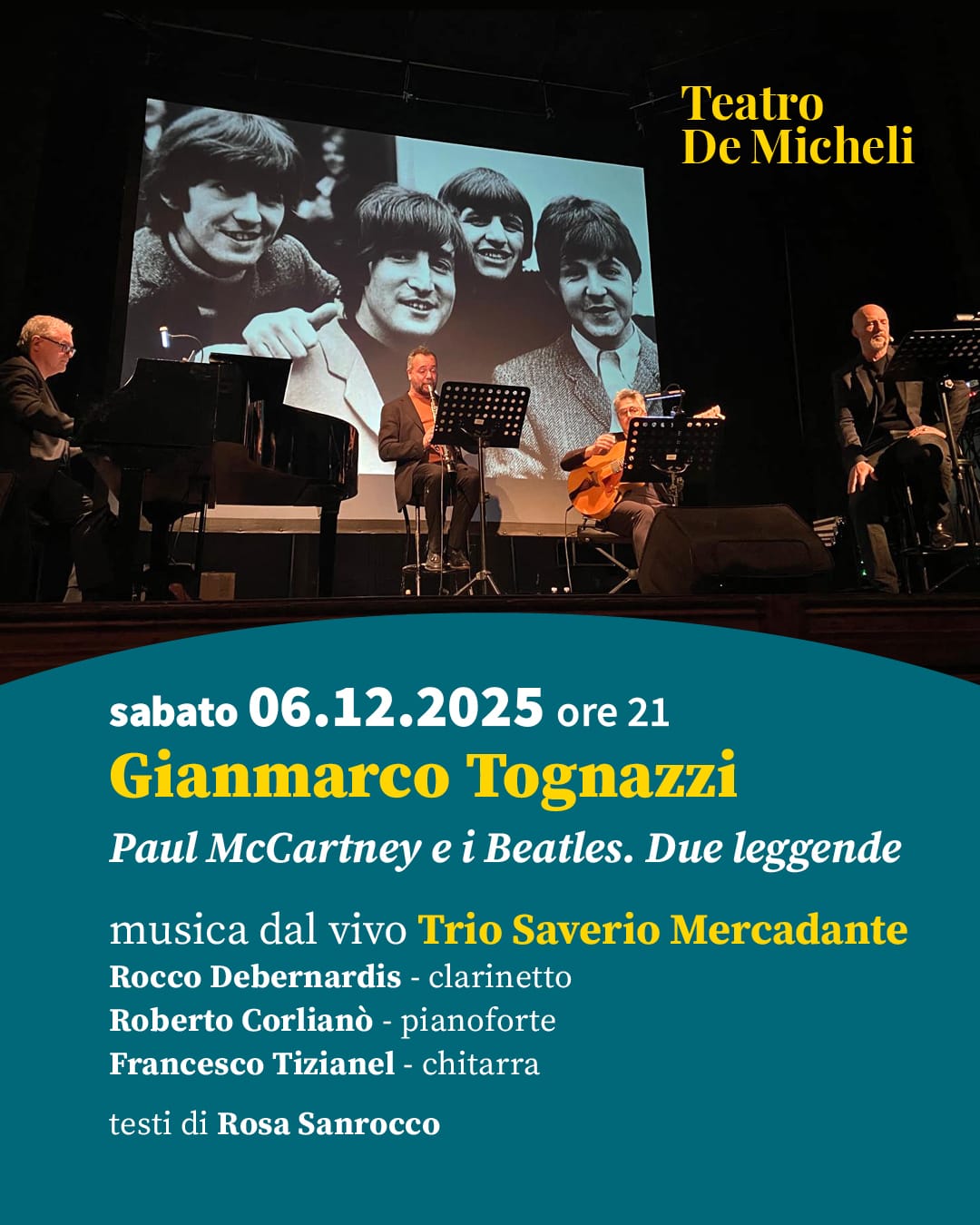 Il Trio Saverio Mercadante propone, in questo spettacolo, alcune tra le più celebri canzoni della band londinese, rielaborate e arrangiate per clarinetto e pianoforte, mentre allo straordinario attore Gianmarco Tognazzi è affidato il compito di dar voce a Paul McCartney, per condurre l’ascoltatore in un viaggio tra le leggende e i misteri dei Beatles.