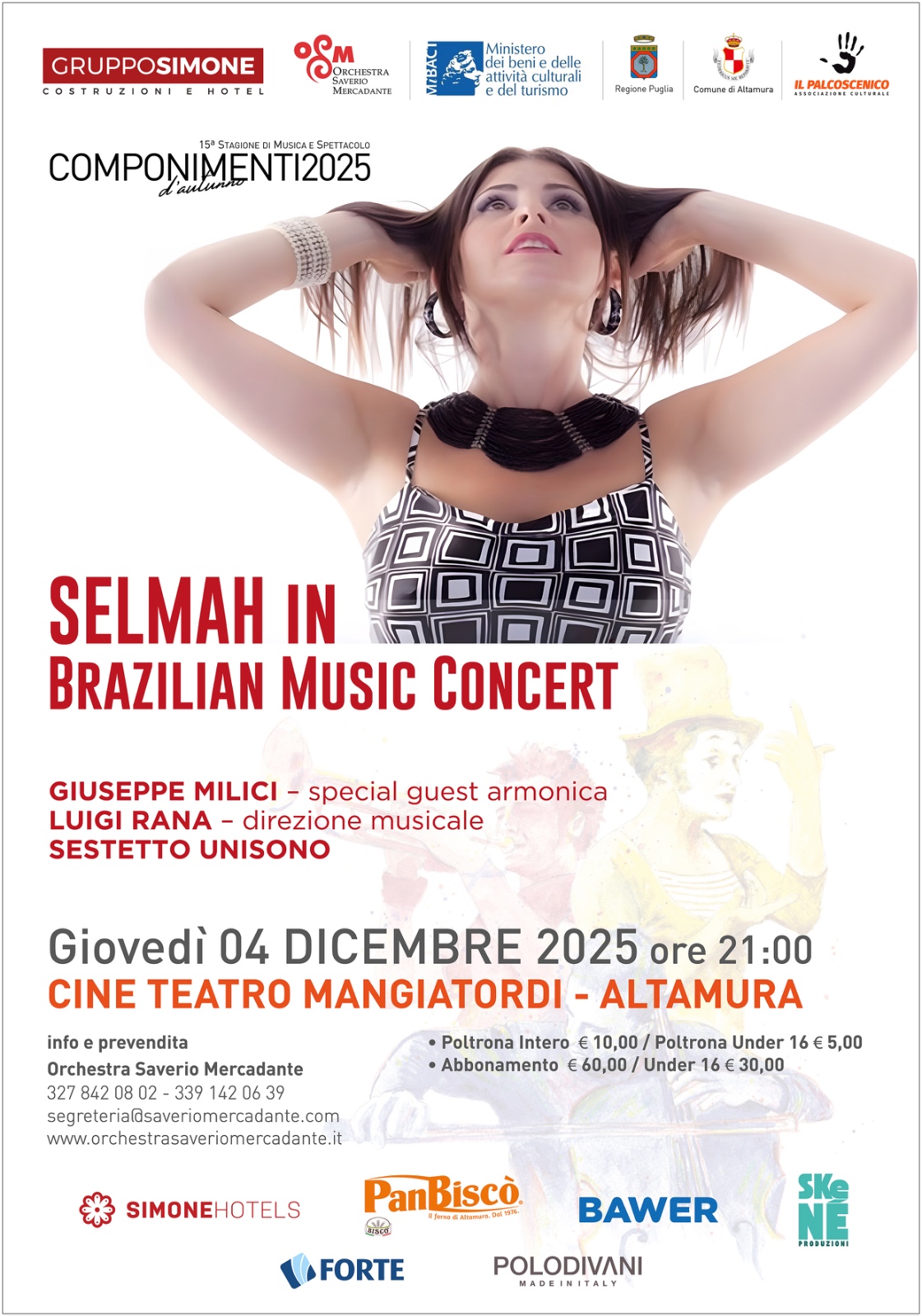 TEATRO MANGIATORDI ALTAMURAL’incontro tra la voce intensa di Selmah e l’armonica poetica di Giuseppe Milici accende un dialogo unico tra Brasile e jazz europeo. Sul palco due artisti raffinati e potenti danno un’impronta nuova ed emozionante al repertorio: la forza interpretativa di Selmah si fonde con il gusto e la tecnica di Milici per un viaggio sonoro...