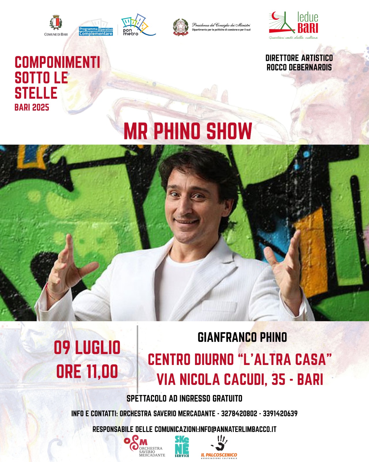 Nell’ambito del Festival “Le Due Bari 2025”, e all’interno del cartellone di Componimenti sotto le stelle – la rassegna ideata dal M° Rocco Debernardis che porta musica, parole e spettacolo nei luoghi vivi e partecipati della città – va in scena Mr. PHINO SHOW