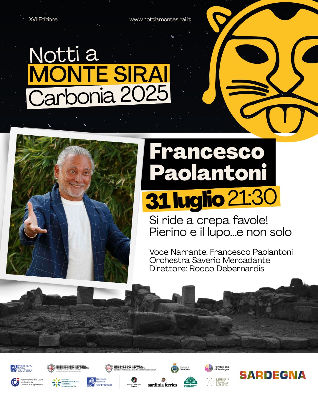 Gran Finale per le “Notti a Monte Sirai” Francesco Paolantoni in “Si ride, a crepa favole!” Pierino e il lupo…e non Giovedì 31 luglio 2025 Monte Sirai Ore 21:30