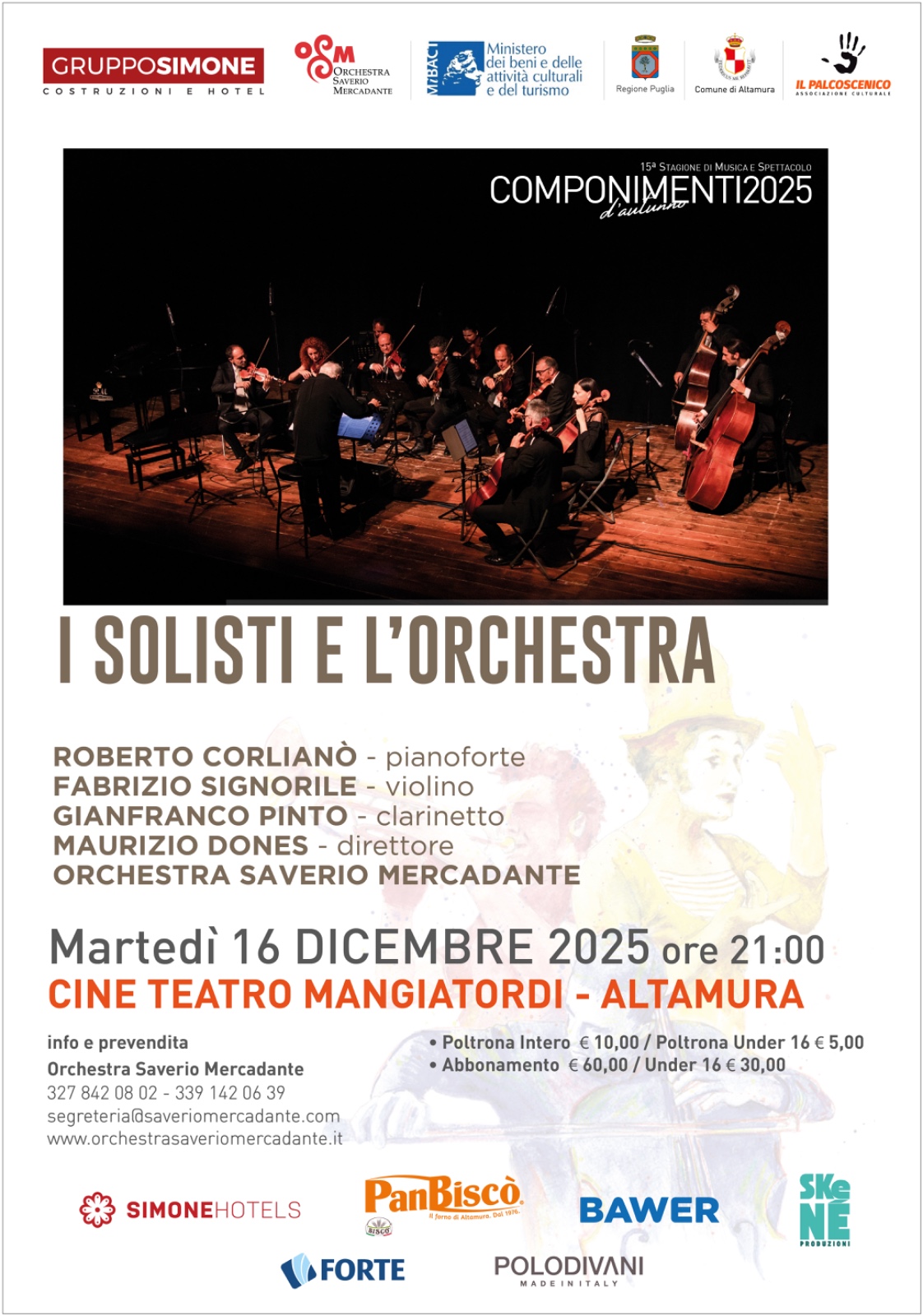 L’Orchestra Saverio Mercadante, diretta dal M° Maurizio Dones, accompagnerà 3 solisti di fama internazionale: Gianfranco Pinto al clarinetto nell’esecuzione del virtuoso Concertino di A. Grgin, Fabrizio Signorile al violino nell’esecuzione delle Danze Popolari Rumene di B. Bartók e Roberto Corlianò al pianoforte nell’esecuzione dell’ultimo Concerto di L. Van Beethoven per pianoforte e orchestra in Mi bemolle maggiore op. 73. Solisti virtuosi e stravaganti, in un repertorio brillante e divertente, che mette in risalto le doti tecniche e musicali degli stessi.