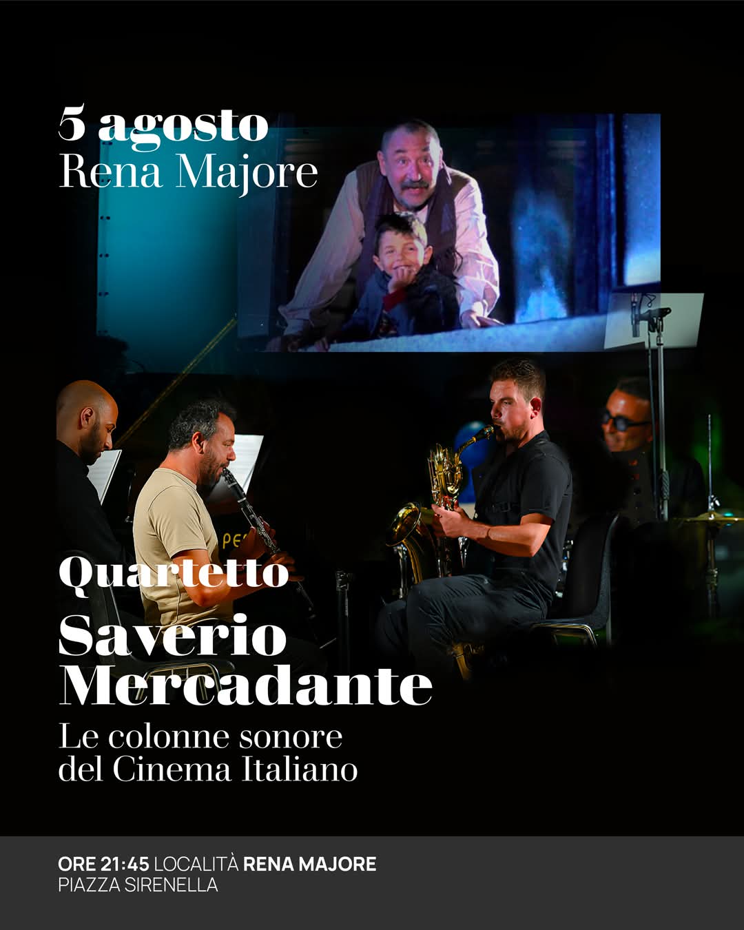 Il Quartetto Saverio Mercadante porta in scena un viaggio musicale tra le opere dei grandi compositori che hanno firmato le musiche dei più celebri film italiani e internazionali: da Morricone a Rota, da Piovani a Hermann.