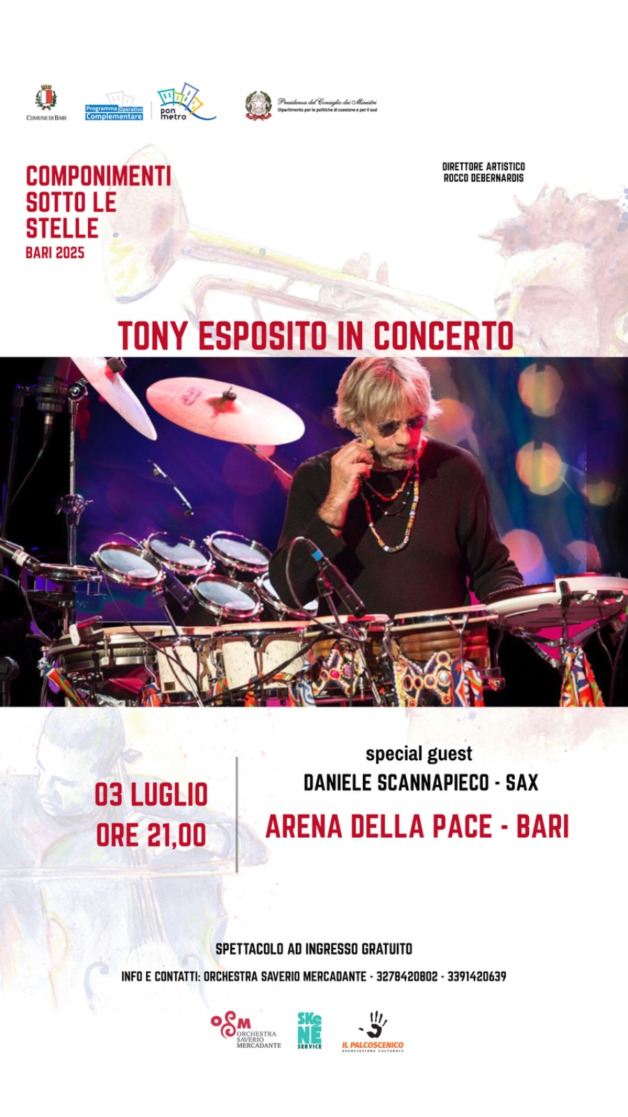 Tony Esposito Il 3 luglio 2025, alle ore 21, all’Arena della Pace di Bari va in scena un appuntamento della rassegna Componimenti sotto le stelle, all’interno del Festival delle Due Bari 2025, con la direzione artistica di Rocco Debernardis.