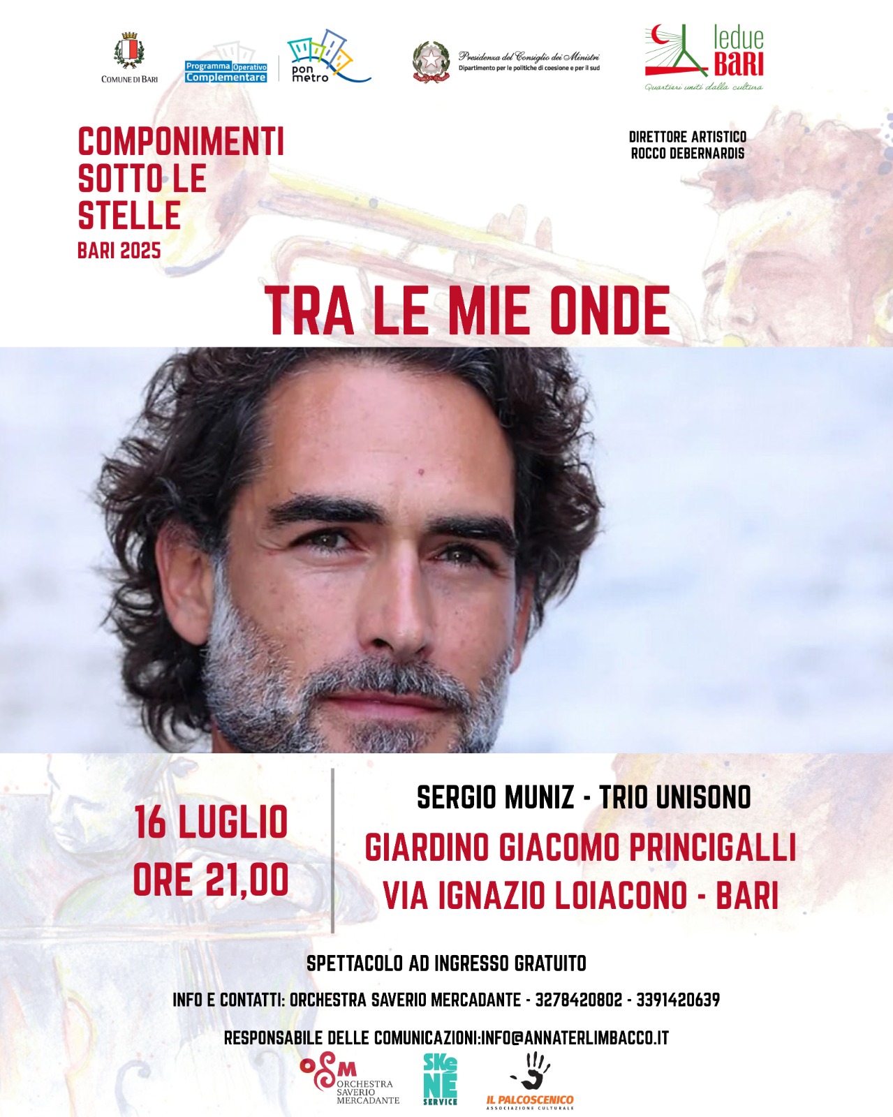 All’interno del Festival “Le Due Bari 2025”, per il cartellone Componimenti sotto le stelle – ideato e diretto dal M° Rocco Debernardis – va in scena “Tra le mie onde”, un viaggio tra musica e parole con Sergio Muñiz e il Trio Unisono.